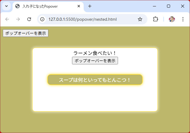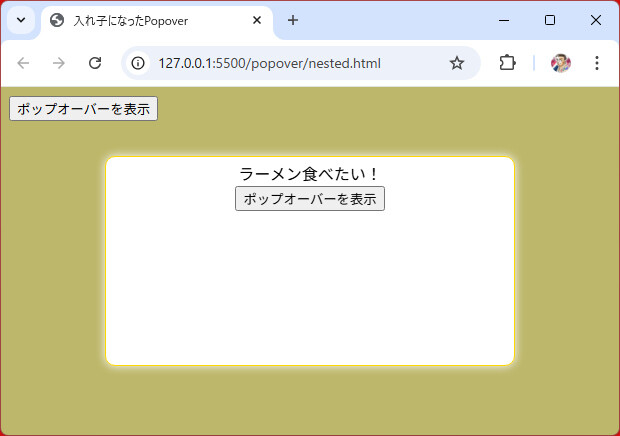 双方ともpopover(="auto")ですが、内側にあるポップオーバーを開いても、外側のポップオーバーは閉じられません。また、外側のポップオーバーを閉じると、内側のポップオーバーも自動的に閉じます。