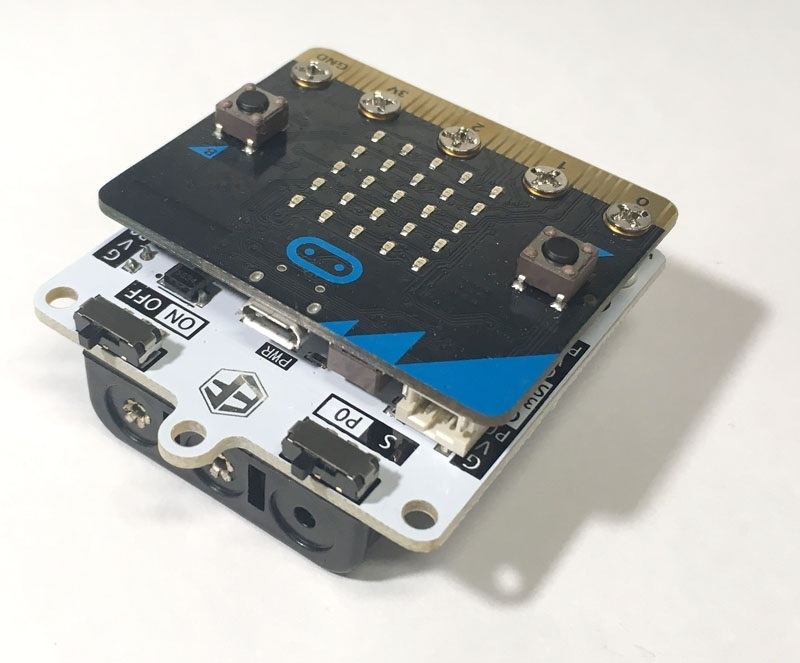 これで完成です。ボード上にある[ON|OFF]と書かれたスイッチをONにして電源が入るかどうか確認してください。無事にマイクロビットの電源が入ればOKです。もし、電源が入らない場合は新しい乾電池にしてみてください。それでも駄目な場合はモーターボードとマイクロビットを取り付けるネジ部分がしっかり接触しているか確認してください。どうしても、電源が入らない場合は不良品の可能性があるので購入元に問い合わせてみてください。
