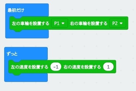最初にモーターの接続端子を設定するブロックを配置します。ロボットを制御するモーターは左の車輪がP1端子に、右の車輪がP2端子に接続されています。もし、P0端子など他の端子に接続している場合は変更してください。