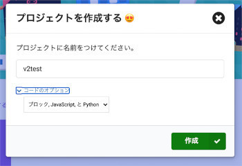 ブロックエディタの画面はこれまでと変わりません。新しいプロジェクトを作成する時にブロックエディタとコードエディタ両方で作るか、それともブロックエディタで作るかのオプションが増えただけです。通常はオプションを指定せずに、そのままプロジェクト名を入れてOKボタンをクリックします。