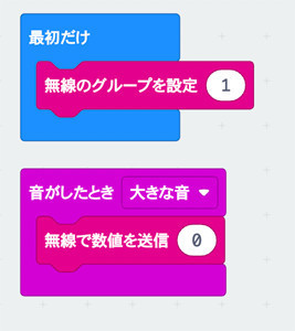 まず、2台のマイクロビットv2を同じ無線グループ番号にします。次に音を検知し送信するマイクロビットv2のプログラムを以下のように作成します。
