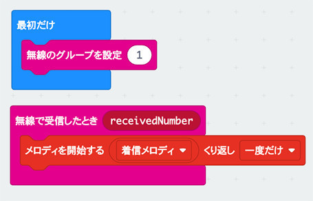 次に受信側のマイクロビットでは無線データを受信したら音楽を鳴らすようにします。このプログラムは以下のようになります。