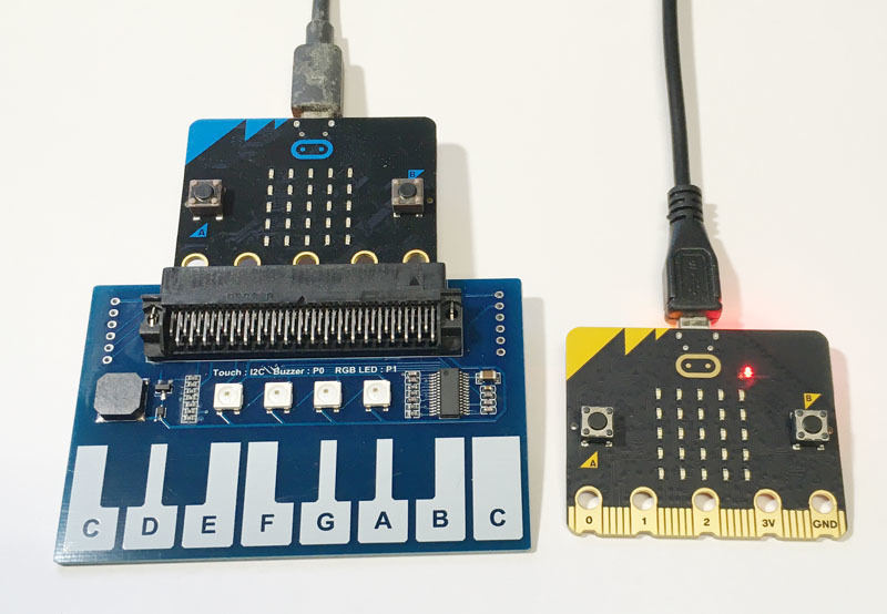 それぞれのマイクロビットにプログラムを転送したら実際に動作するか確認してみましょう。ここでは、分かりやすくするために音を検知する方をマイクロビットv2に、音を演奏するのはピアノモジュールを接続した旧マイクロビットで動作させています。